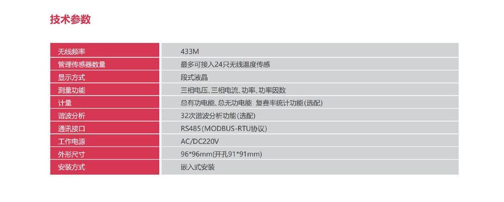 管理傳感器數量:最多可接入 24 只無線測溫傳感器,無線頻率:433MHz。外形尺寸:96*96mm(開孔 91*91)。