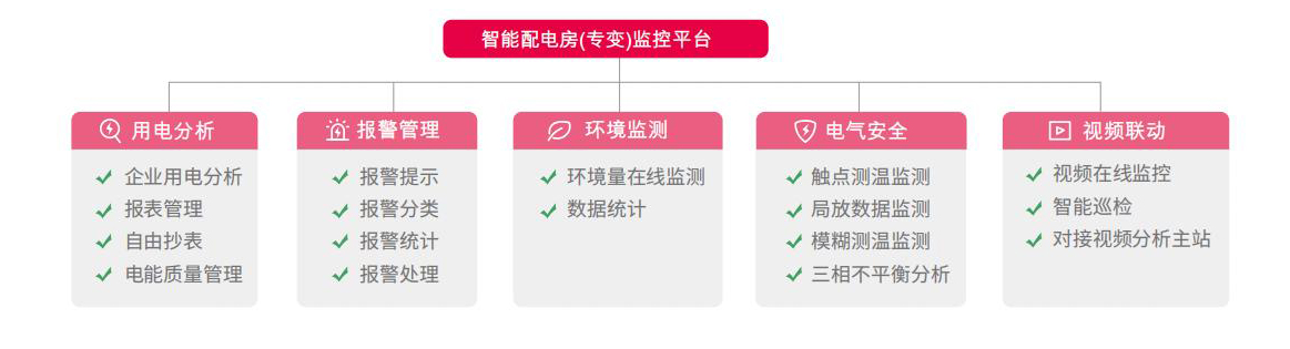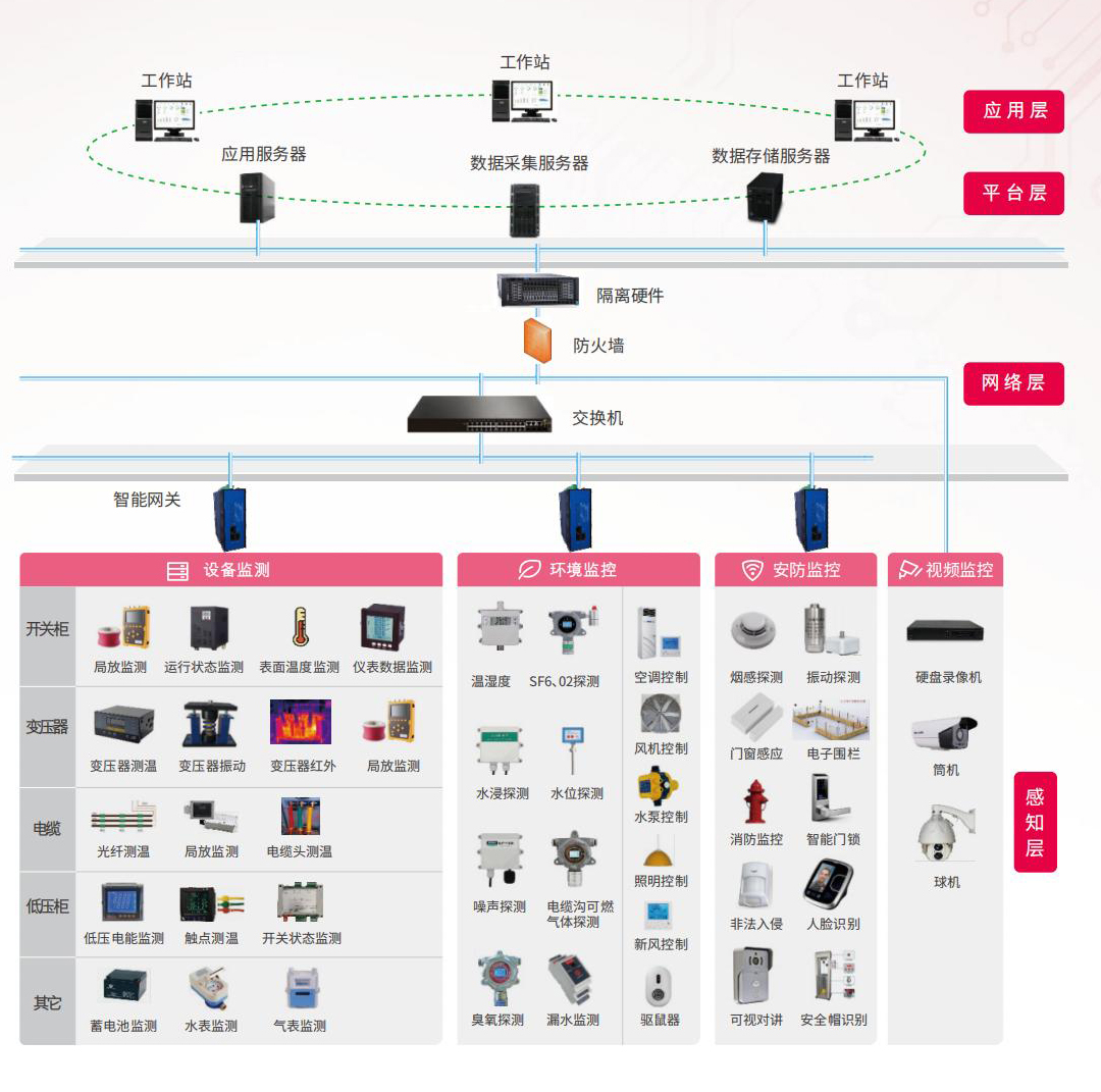 智能配電房(專變)監控平臺可針對其?業??特性和現場?案給出不同的應??系統,同時配套對應的智能硬件產品,為??提供完 整的應?級系統解決?案。