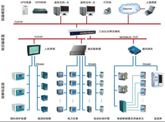 采用三層的網絡分布式結構,它包括站控管理層、網絡通訊層和現場設備層。站控管理層包括:監控制主機、打印機等;網絡通訊層包括:工業以太網交換機、通訊網關、通訊服務器、人機界面等;現場設置層包括:電力監測儀表、監控儀表、微機綜合保護裝置等。其中的通訊可采用通訊電纜