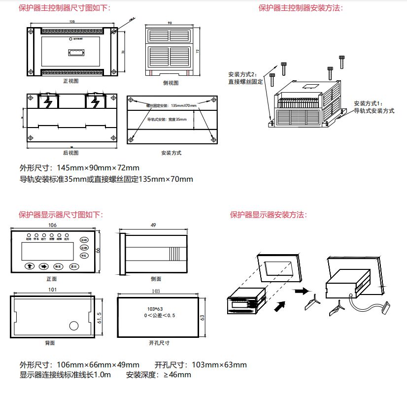 保護器主機:標準35mm導軌或直接螺絲固定顯示器:嵌入式安裝