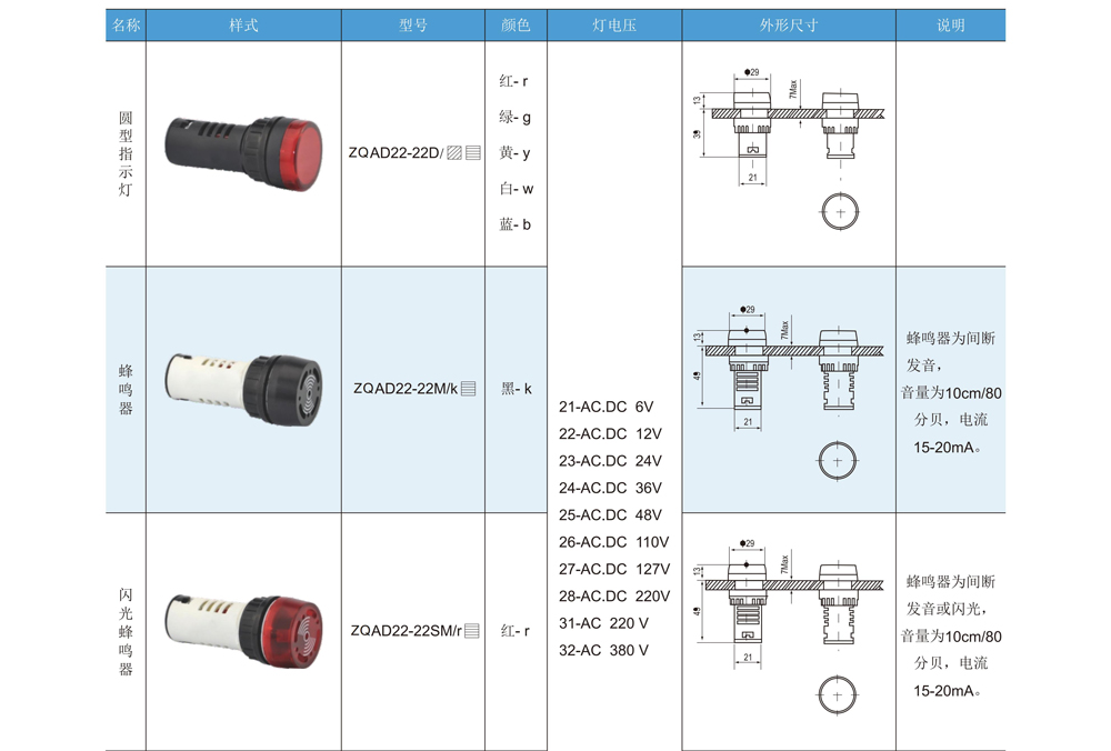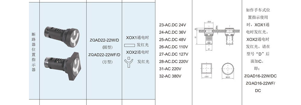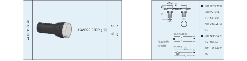 產品用途ZQAD22系列指示燈適用于電力、電訊、機床、船舶、紡織、印刷、礦山機械等設備的線路中作指示信號、預告信號、事故信號及其他指示用信號。