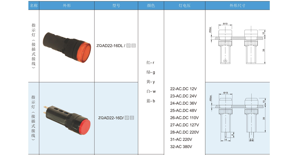 ZQAD22系列指示燈均采用高亮純色LED發光芯片為光源,壽命長、耗能低、體積小、重量輕,是XD型各類白熾燈和氖燈指示燈的更新換代產品。我廠相繼推出的AD22-22型、AD22-16型指示燈以高亮度高,可靠性好,造型美觀和制作精巧為特點,普遍得到廣大用戶的好評,為滿足用戶日益提高的品質和審美要求,我們又開發出AD22-22雙色燈、位置指示器、閃光蜂鳴器及超短型指示燈,并采用了與LA31系列按鈕風格相一致的外觀設計,燈罩內可刻印各種國際標準符號或定制符號,燈罩采用高強度聚碳酸酯制成,具有良好的抗沖擊性能,內置螺釘式接線,更安全、方便,所有的改進都將使您的選用更方便,設計更完美。